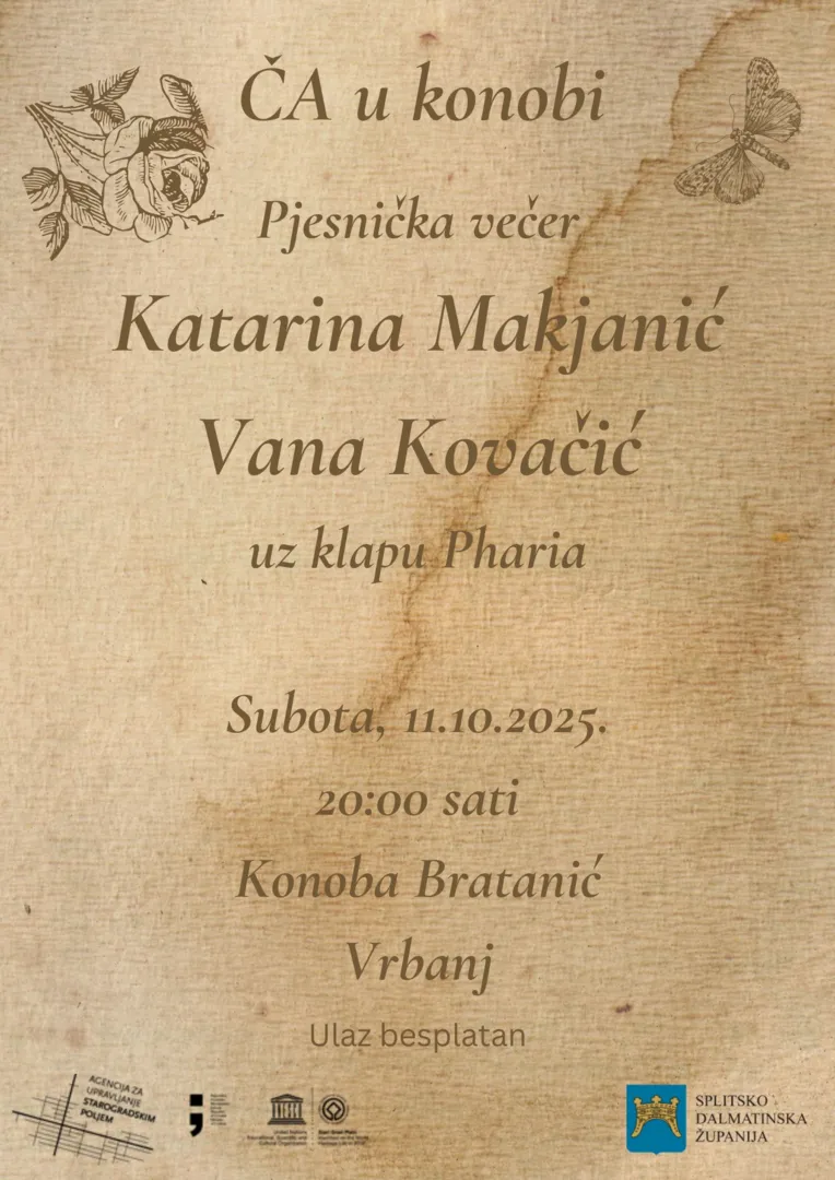 U subotu 11. listopada s početkom u 20:00 sati u konobi obitelji Bratanić održati će se pjesnička večer “ČA u konobi” u kojoj će sudjelovati pjesnikinje Katarina Makjanić i Vana Kovačić uz pratnju klape Pharia.