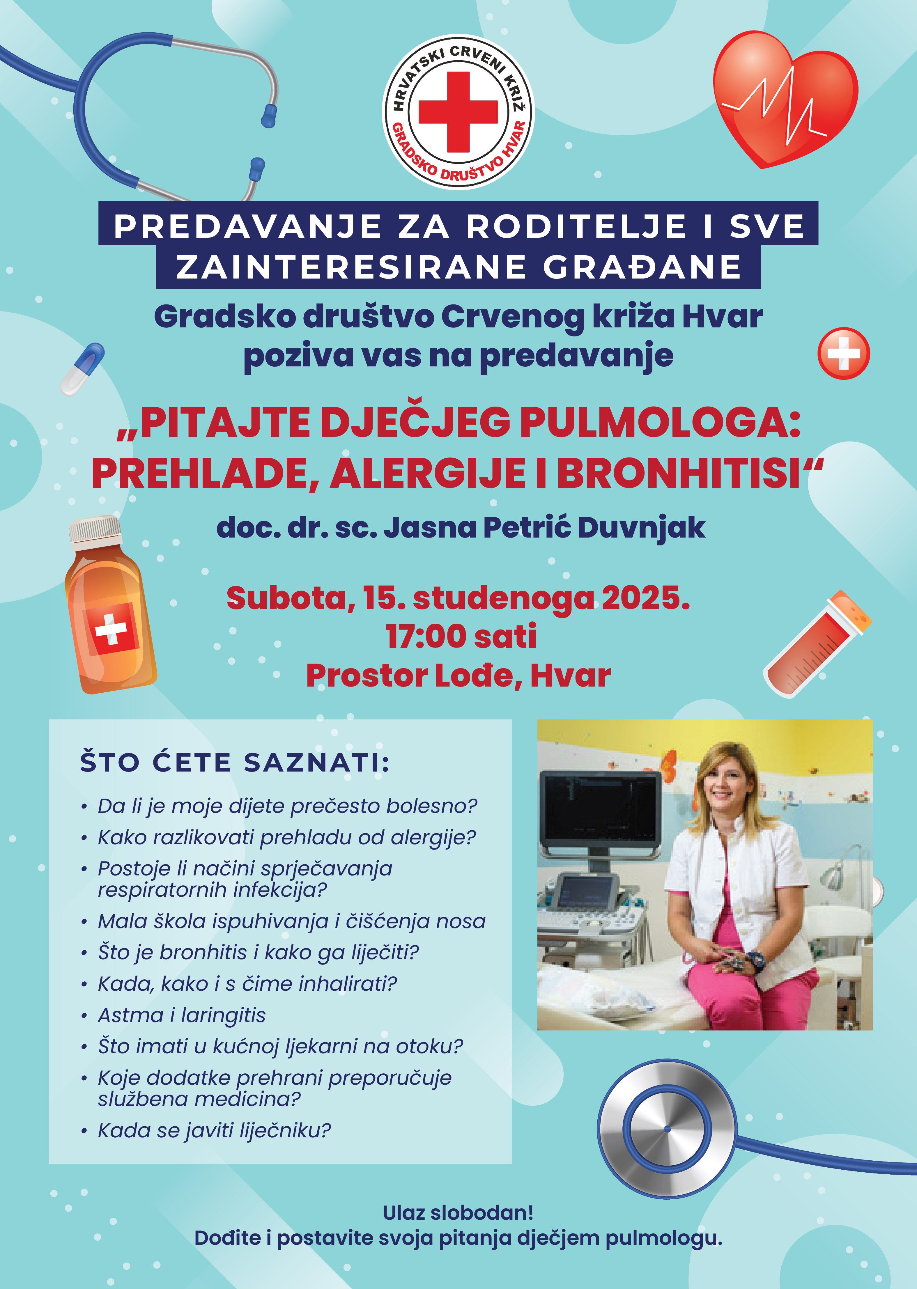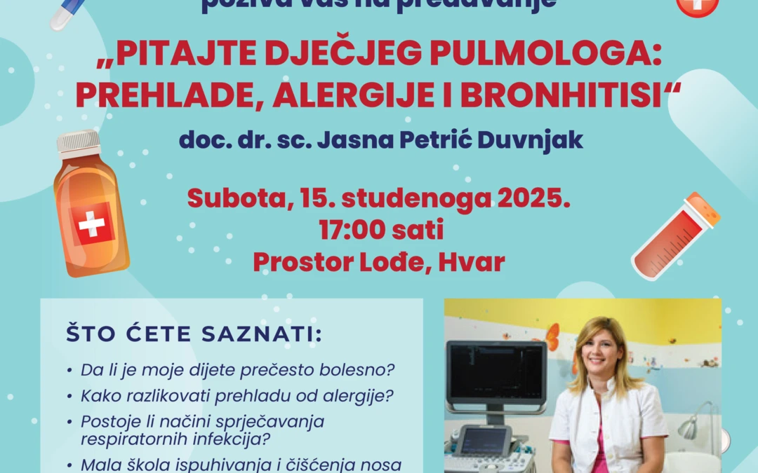 Poziv za predavanje dječjeg pulmologa u gradu Hvaru 15.11.2025. saznajte u nastavku.