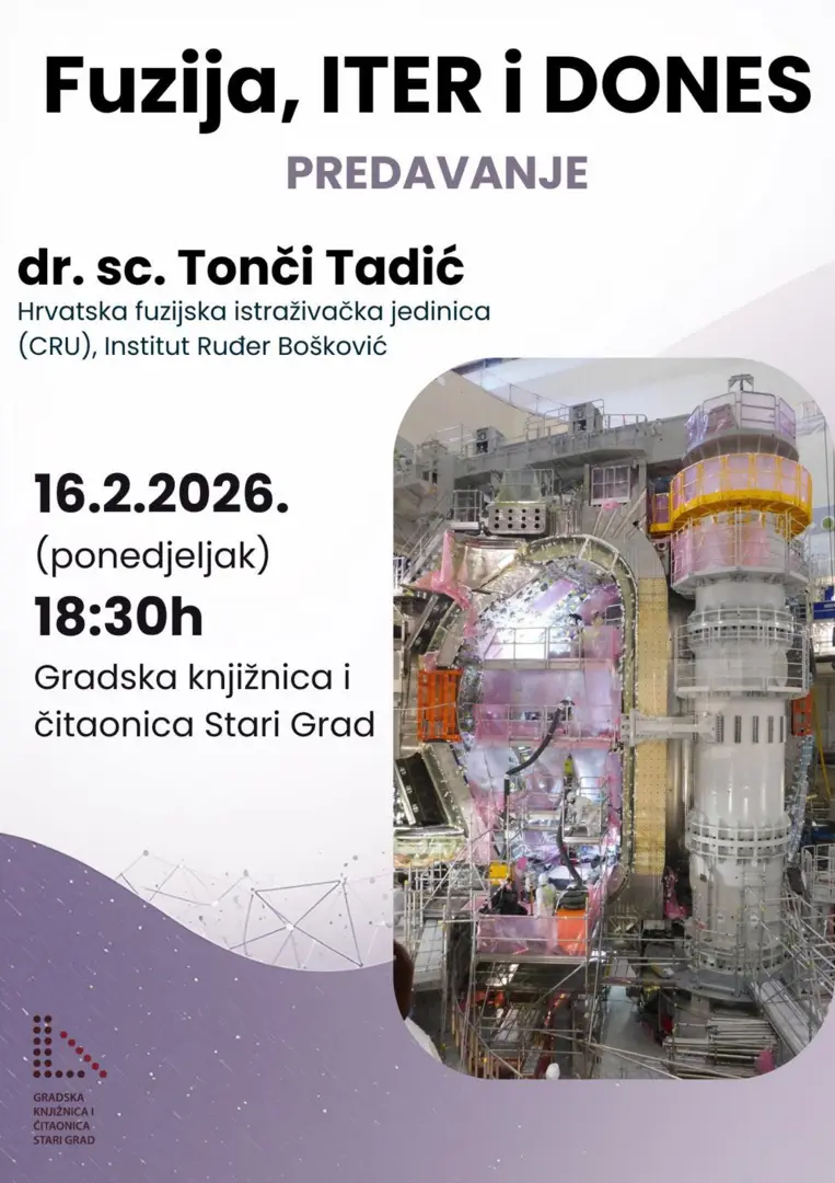 Pozivamo vas na predavanje koje će u ponedjeljak, 16.2. 2026. u 18:30 h, održati dr. sc. Tonči Tadić iz Hrvatske fuzijske istraživačke jedinice (CRU) pri Institutu Ruđer Bošković: Fuzija, ITER i DONES