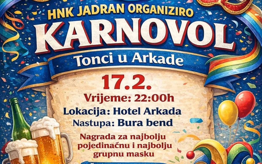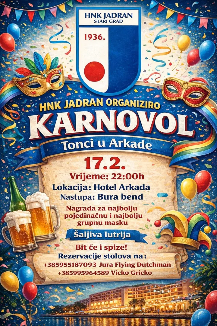 HNK Jadran Stari Grad organizira u utorak, 17. veljače 2026. godine, ples pod maskama - KARNOVOL s početkom u 22:00 h na lokaciji: Hotel Arkada. Nastupa Bura bend.