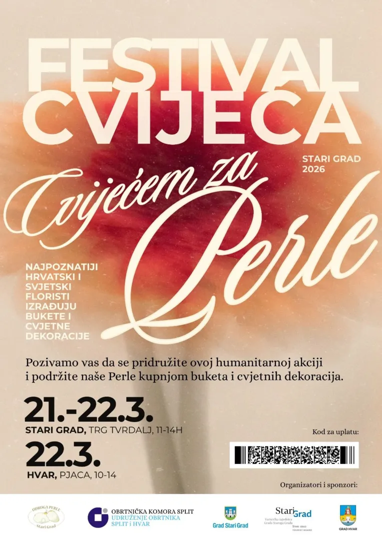 U razdoblju od 21. do 22. ožujka 2026. godine održat će se FESTIVAL CVIJEĆA - CVIJEĆEM ZA PERLE u Starome Gradu i u Hvaru.