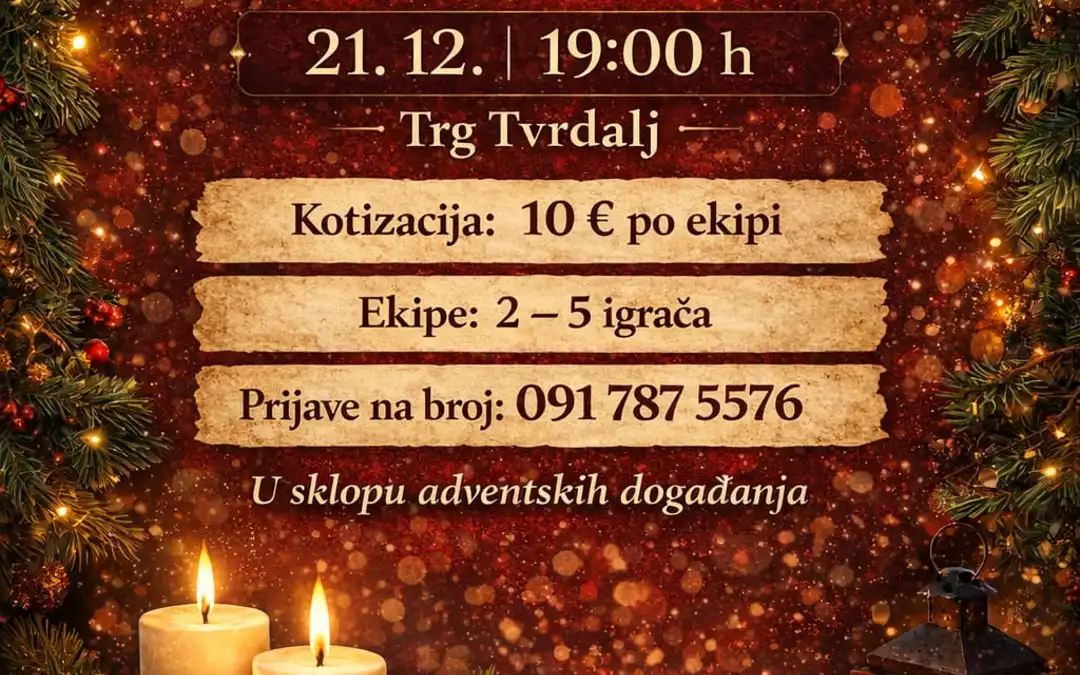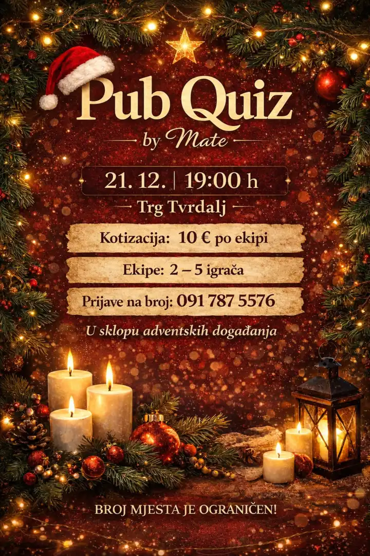 21. prosinca 2025. godine u 19:00 h, naTrgu Tvrdalj u sklopu održavanja Adventa održat će se PUB QUIZ BY MATE.