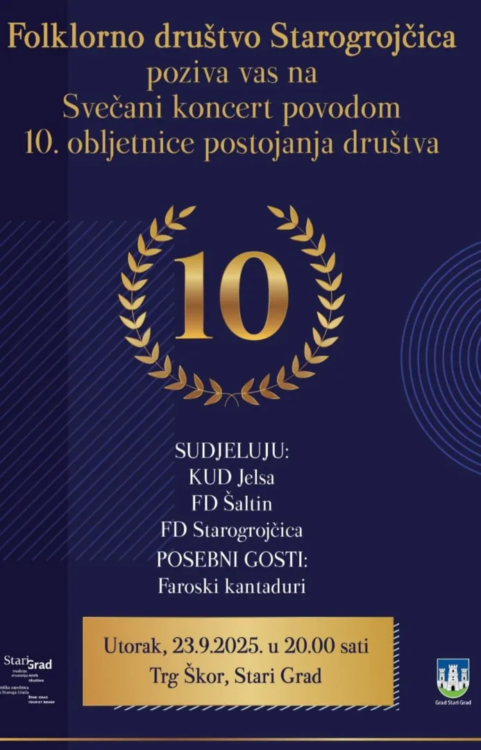 U utorak, 23. rujna 2025. godine, održat će se Svečani koncert i druženje povodom proslave 10. godišnjice osnivanja FOLKLORNOG DRUŠTVA STAROGROJČICA, na trgu Škor u 20:00 h.