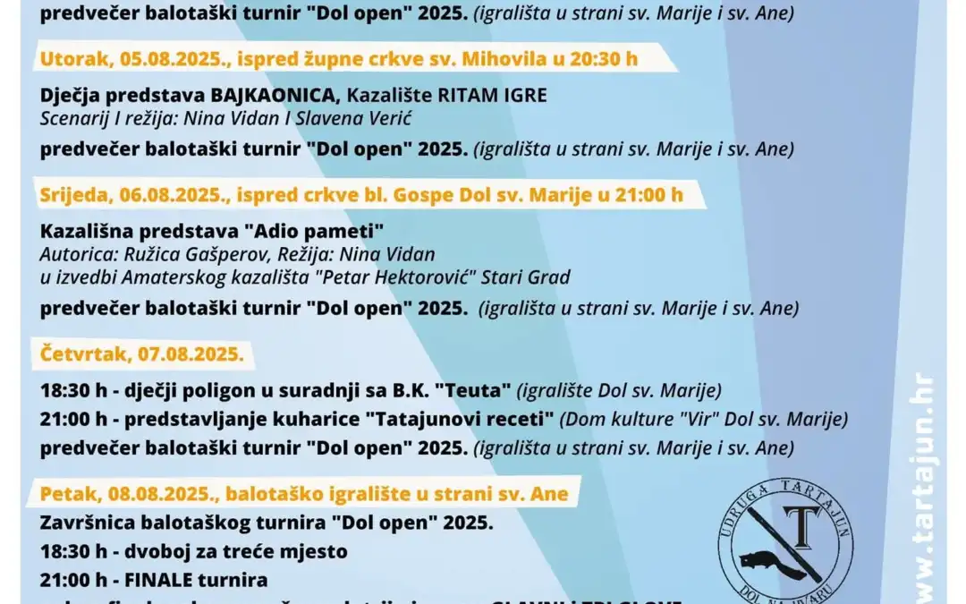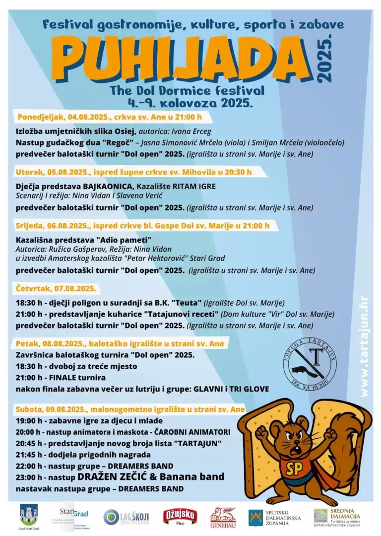 Festival gastronomije, kulture, sporta i zabave PUHIJADA 2025. održat će se u Dolu u razdoblju od 4. do 9. kolovoza 2025. godine.