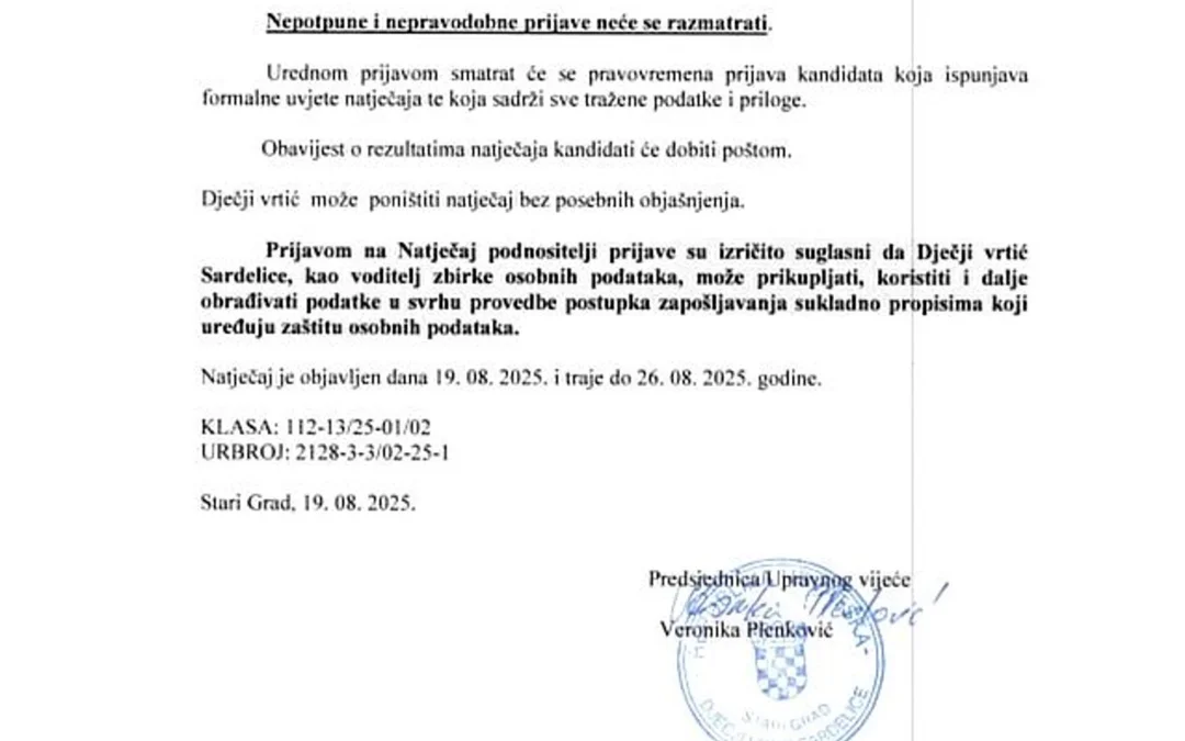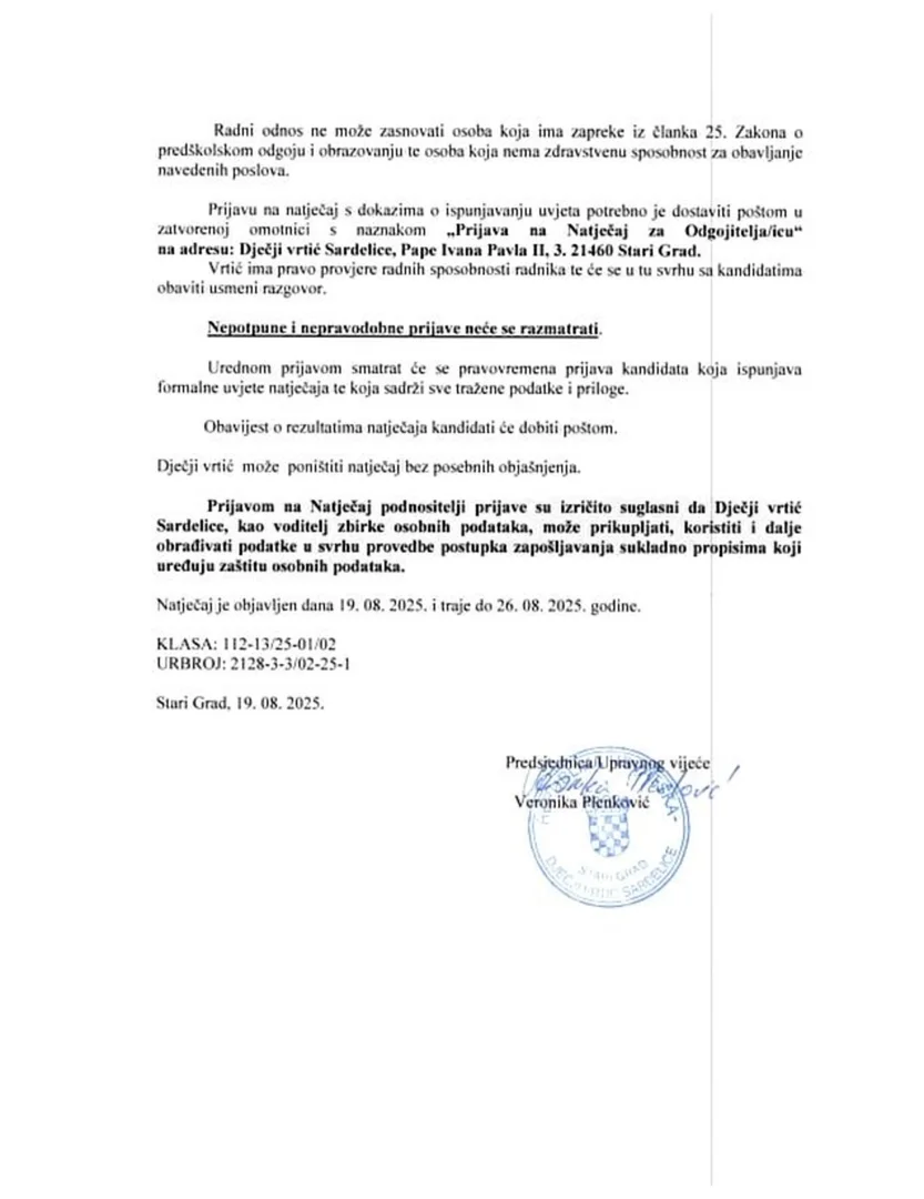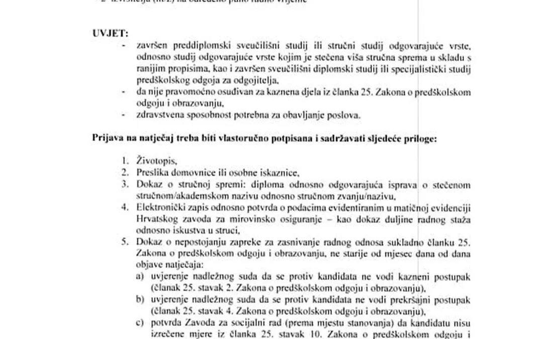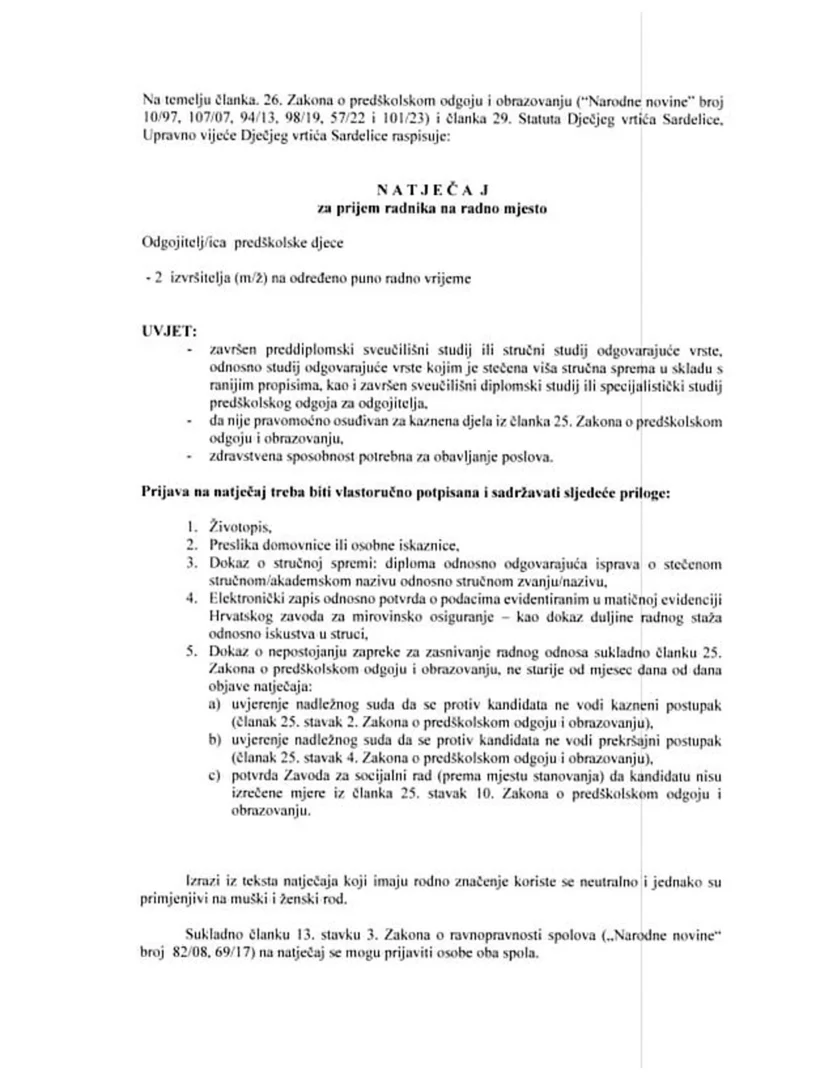 Dječji vrtić Sardelice raspisuje natječaj za prijem radnika na radno mjesto odgojitelj/ica predškolske djece