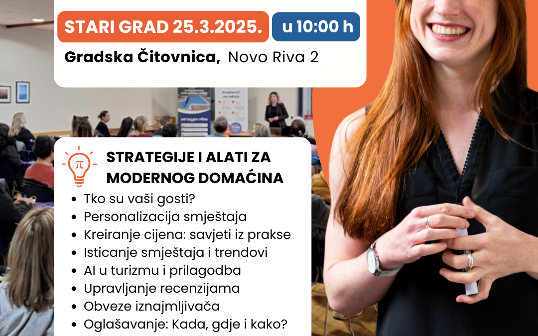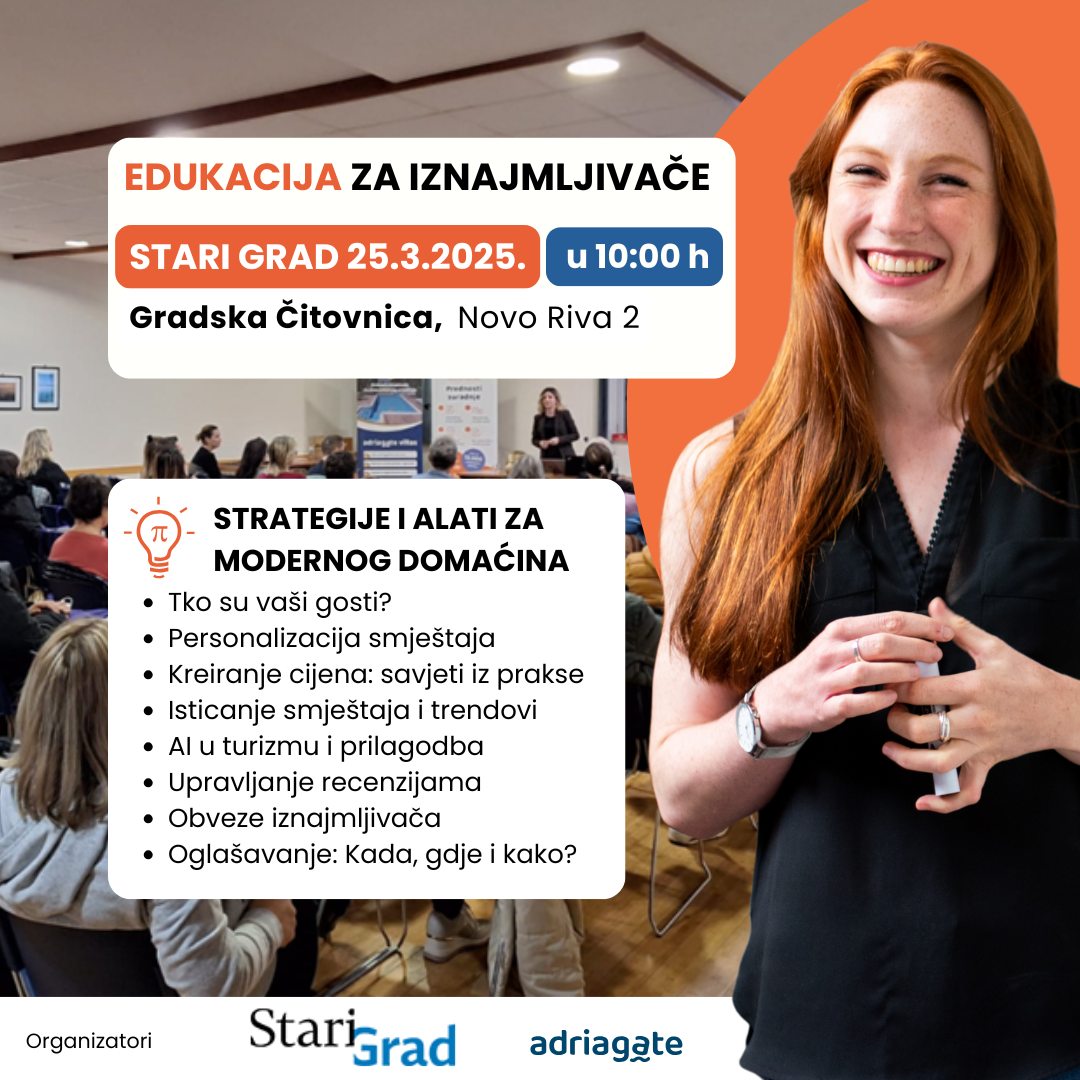 Turistička zajednica grada Hvara u suradnji sa turističkom agencijom Adriagate organizira besplatnu edukaciju za iznajmljivače „Ključ uspješnog iznajmljivanja apartmana, vila i kuća za odmor“.