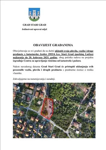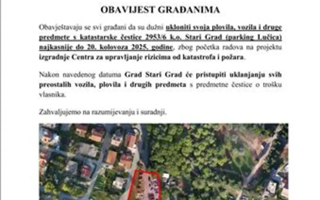 Obavještavaju se svi građani da su dužni ukloniti svoja plovila, vozila i druge predmete s katastarske čestice 2953/6 k.o. Stari Grad (parking Lučica) najkasnije do 20. kolovoza 2025. godine, zbog početka radova na projektu izgradnje Centra za upravljanje rizicima od katastrofa i požara.