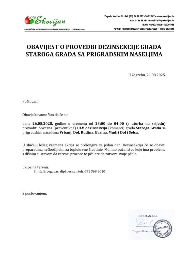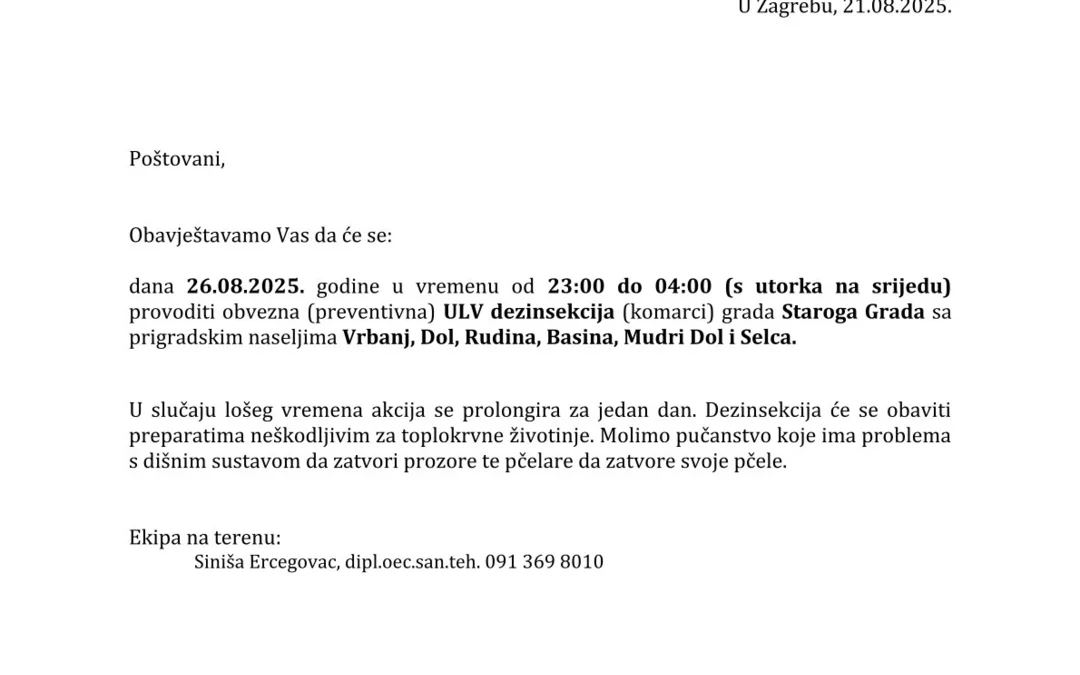 Obavijest Ekocijana d.o.o. vezano za provođenje adulticidnog suzbijanja komaraca na području Grada Staroga Grada i prigradskih naselja za dan 26. kolovoza 2025. godine, saznajte u privitku.