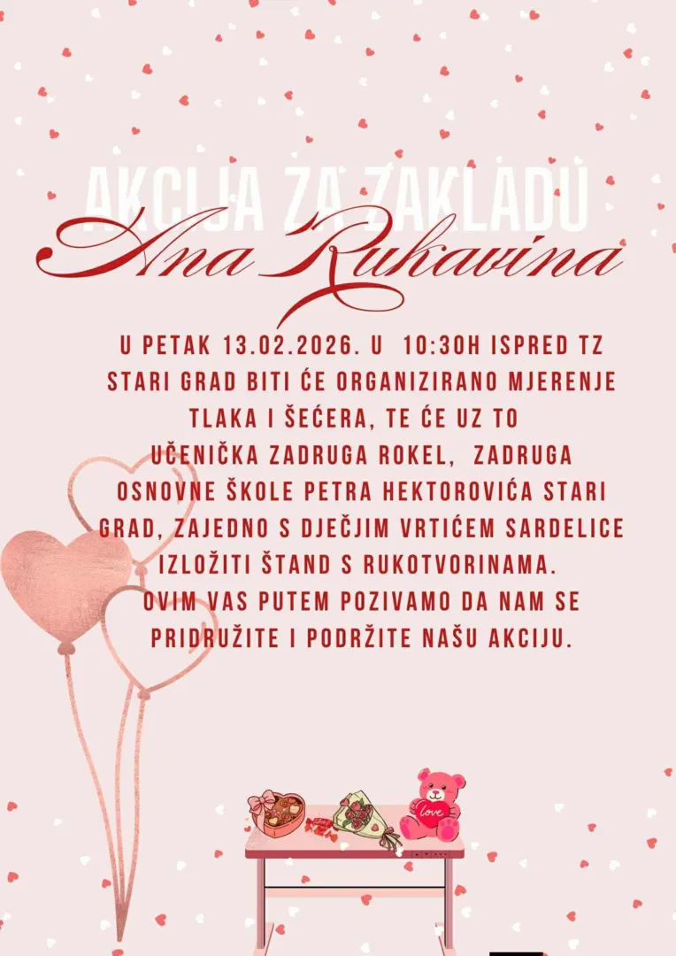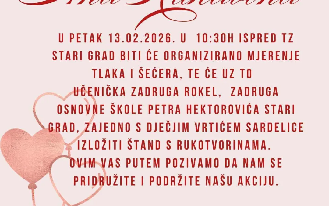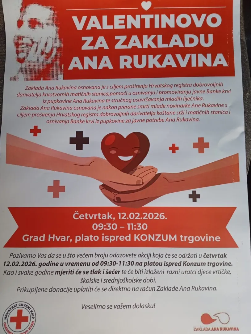 Crveni križ Hvar i ove godine, već tradicionalno, obilježava Valentinovo akcijom koja spaja ljubav i solidarnost. Na našim štandovima u Hvaru, Starom Gradu i Jelsi moći ćete kupiti rukotvorine i uratke djece i učenika iz dječjih vrtića, osnovnih škole te srednje škole – male ruke, veliko srce. Svaki crtež, ukras i sitnica nosi poruku dobrote i nade. U suradnji s patronažnom djelatnošću Doma zdravlja Splitsko-dalmatinske županije, građani će moći izmjeriti krvni tlak i šećer u krvi, jer ljubav prema drugima počinje i brigom o vlastitom zdravlju. Sav prikupljeni novac bit će uplaćen Zakladi Ana Rukavina, koja se već godinama neumorno bori za ono najvrjednije – život. Zaklada se bavi širenjem Registra darivatelja krvotvornih matičnih stanica, edukacijom javnosti i tipizacijom tkiva, kako bi oboljeli od teških bolesti dobili svoju priliku za ozdravljenje. Ovo nije samo Valentinovo s čokoladama i cvijećem. Ovo je Valentinovo koje ima smisao. Valentinovo u kojem ljubav postaje djelo. Hvala svima koji sudjeluju, pomažu i daruju – jer nekome baš vaša mala gesta može značiti cijeli život. Akcije u Hvaru i Jelsi će se održati u četvrtak 12.2. ,a u Starom Gradu u petak, 13.2.2026. godine.
